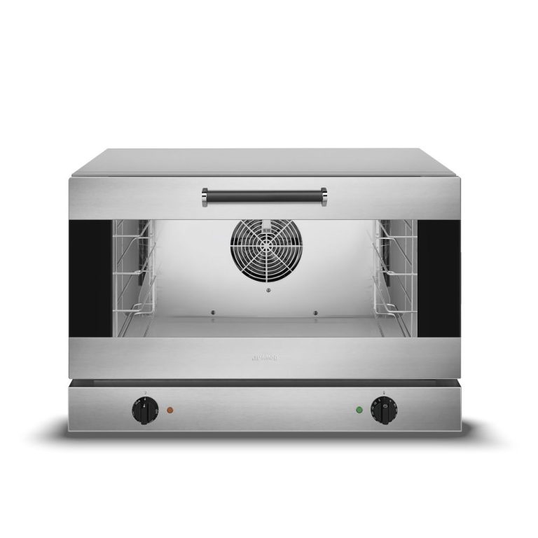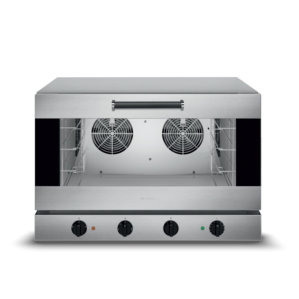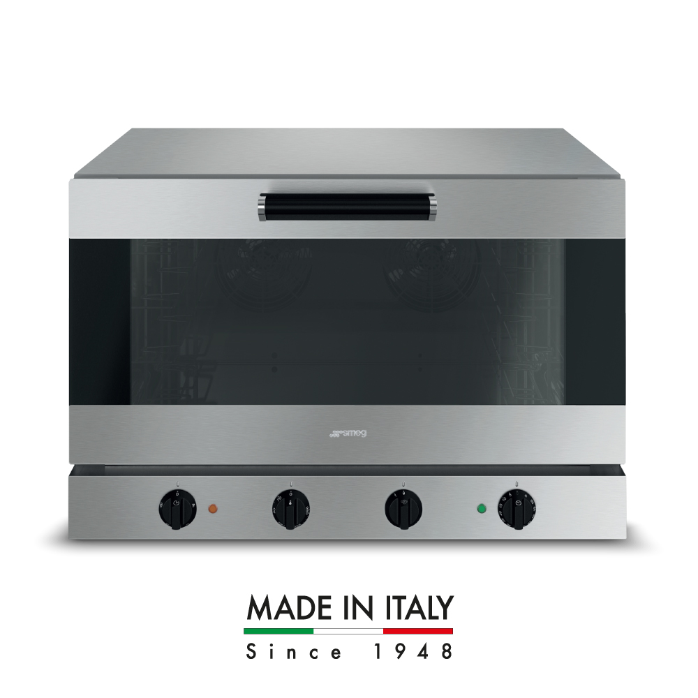 Κυκλοθερμικός φούρνος multifunction, με υγραντήρα απ’ευθείας ψεκασμού, χωρητικότητας 4 λαμαρινών (600×400 mm) του εργοστασίου Smeg Ιταλίας. Λειτουργίες: Αερόθερμο / Στατικό ψήσιμο πάνω-κάτω / Αυτόνομο Grill / Στατικό ψήσιμο κάτω & ανεμιστήρας / Κυκλοθερμικό ψήσιμο με υγραντήρα (άνω των 150ºC)