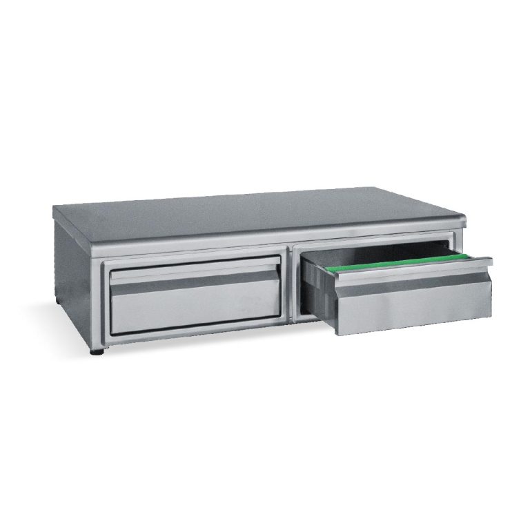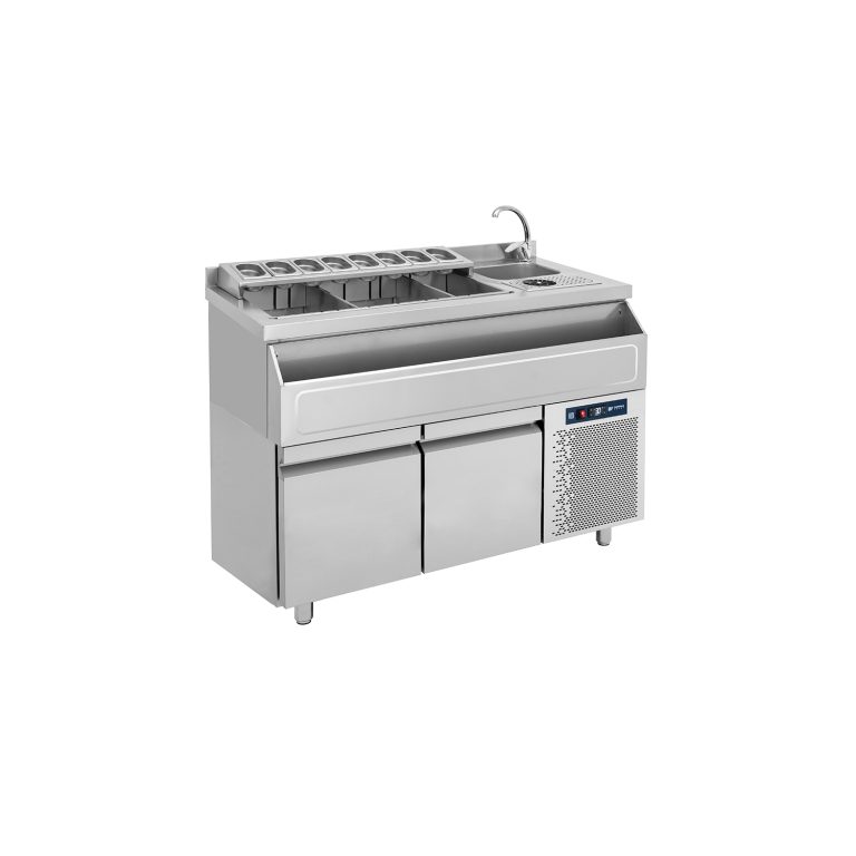 Κατασκευασμένο από ανοξείδωτο χάλυβα 304L Μονωμένη λεκάνη πάγου Δυο ανοξείδωτα διαχωριστικά λεκάνης πάγου με δυνατότητα αλλαγής θέσης Όλα τα εξαρτήματα της λεκάνης πάγου είναι αποσπόμενα για εύκολο καθάρισμα Βάση για λεκανάκια GN 1/9 αποσπώμενη Σήκωμα στο καπάκι Θήκη για μπουκάλια αποσπώμενη για εύκολο καθαρισμό Γούρνα 24Χ30Χ15 Ρινσερ νερού