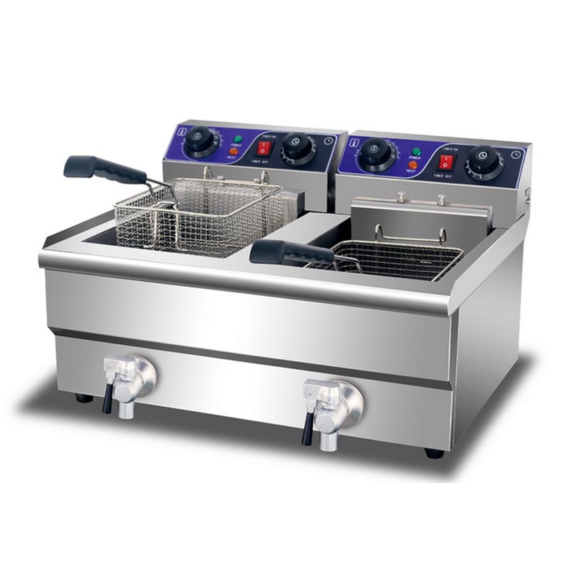 Επαγγελματική φριτέζα ηλεκτρική τριφασική FRYDT10, χωρητικότητας 10lt+10lt και εξωτερικών διαστάσεων 690x540x410mm. Κατασκευή από ανοξείδωτο σώμα, διαθέτει θερμικό ασφαλείας,στρογγυλεμένο κάδο, χρονοδιακόπτη, βρυσάκι απορροής λαδιού και ισχύ 6+6Kw.