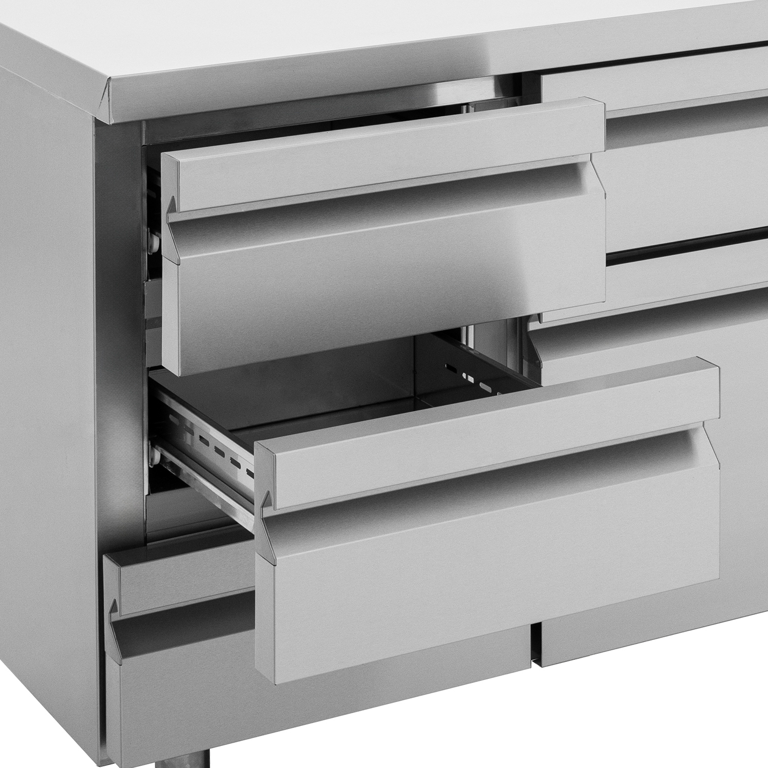 Κατασκευασμένο από ανοξείδωτο χάλυβα Μόνωση με οικολογική πολυουρεθάνη πάχους 5 cm Οδηγοί βαρέως τύπου Υγειονομικά μαγνητικά λάστιχα που αφαιρούνται εύκολα Δυνατότητα τοποθέτησης λεκανών GN μέσα στο συρτάρι